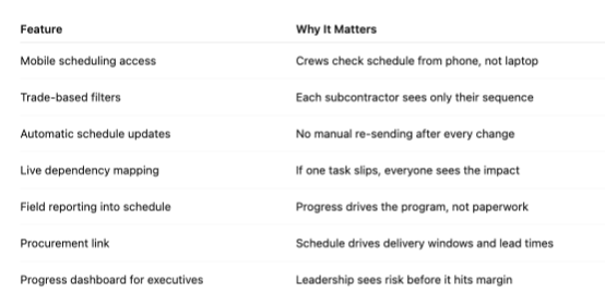 If your schedule still lives in a spreadsheet, email thread or PDF, you are not coordinating a project. You are reacting to it. Digital scheduling gives you control, predictability and accountability across every trade and workfront. And when scheduling connects to the rest of your project systems, you stop managing chaos and start managing outcomes.