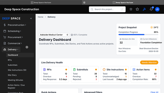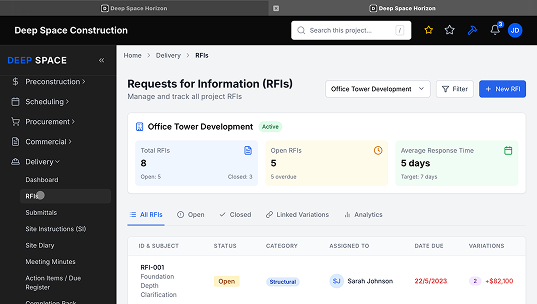 Deep Space brings everything into one connected system where every site activity, from work completed to RFIs raised, is tracked, structured and linked back to the job.