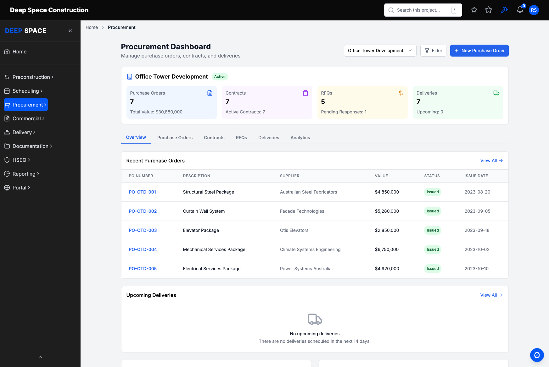 Deep Space doesn’t treat procurement like a side process. It’s fully tied into the construction lifecycle.